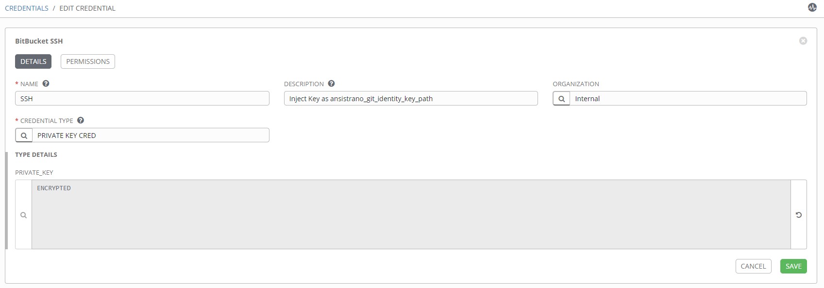 With the new Credential type, create an new SSH Credential in AWX. Go to Credential and select the new type. Copy in the privat SSH key for accessing the Git Repositories.